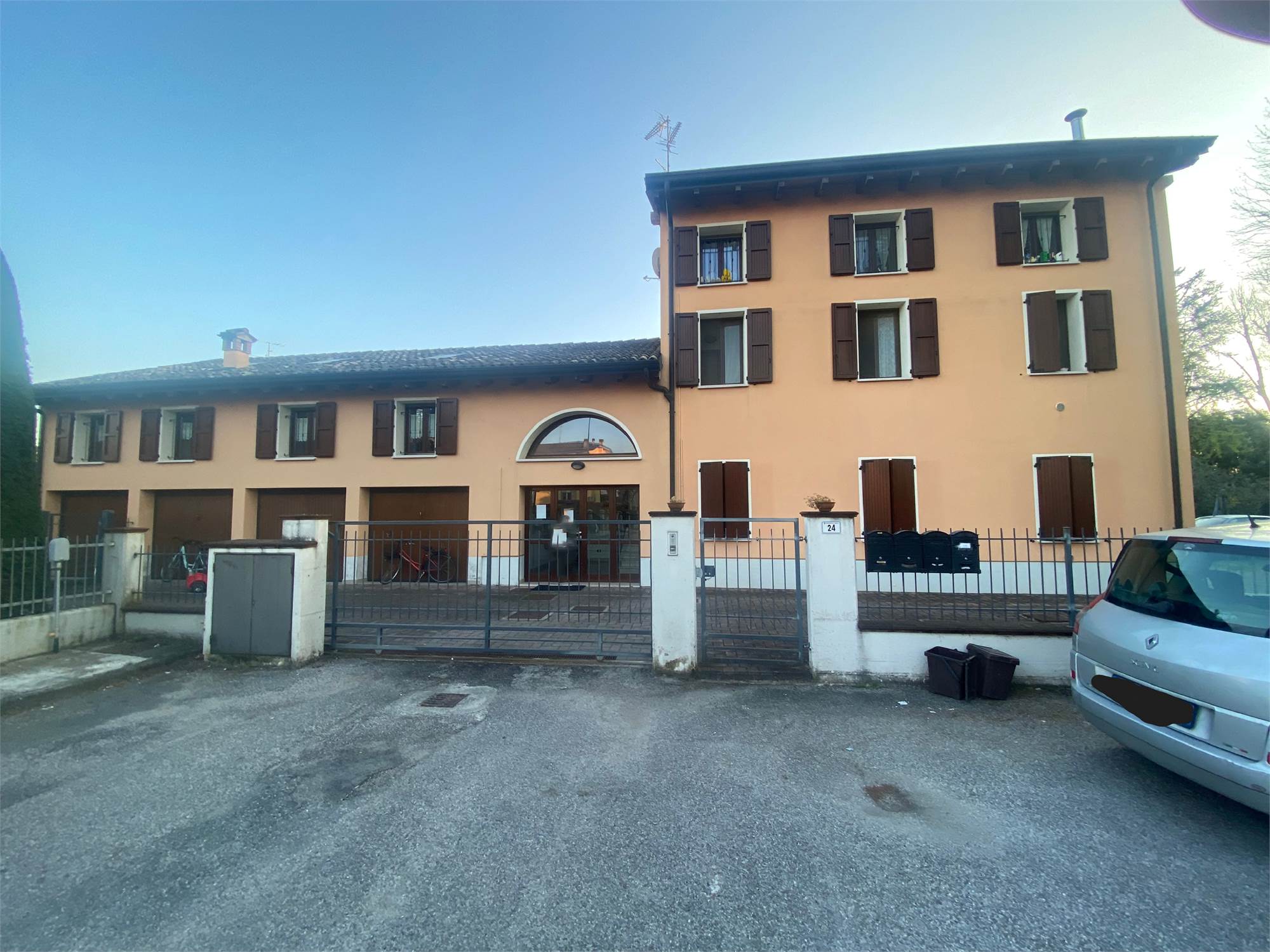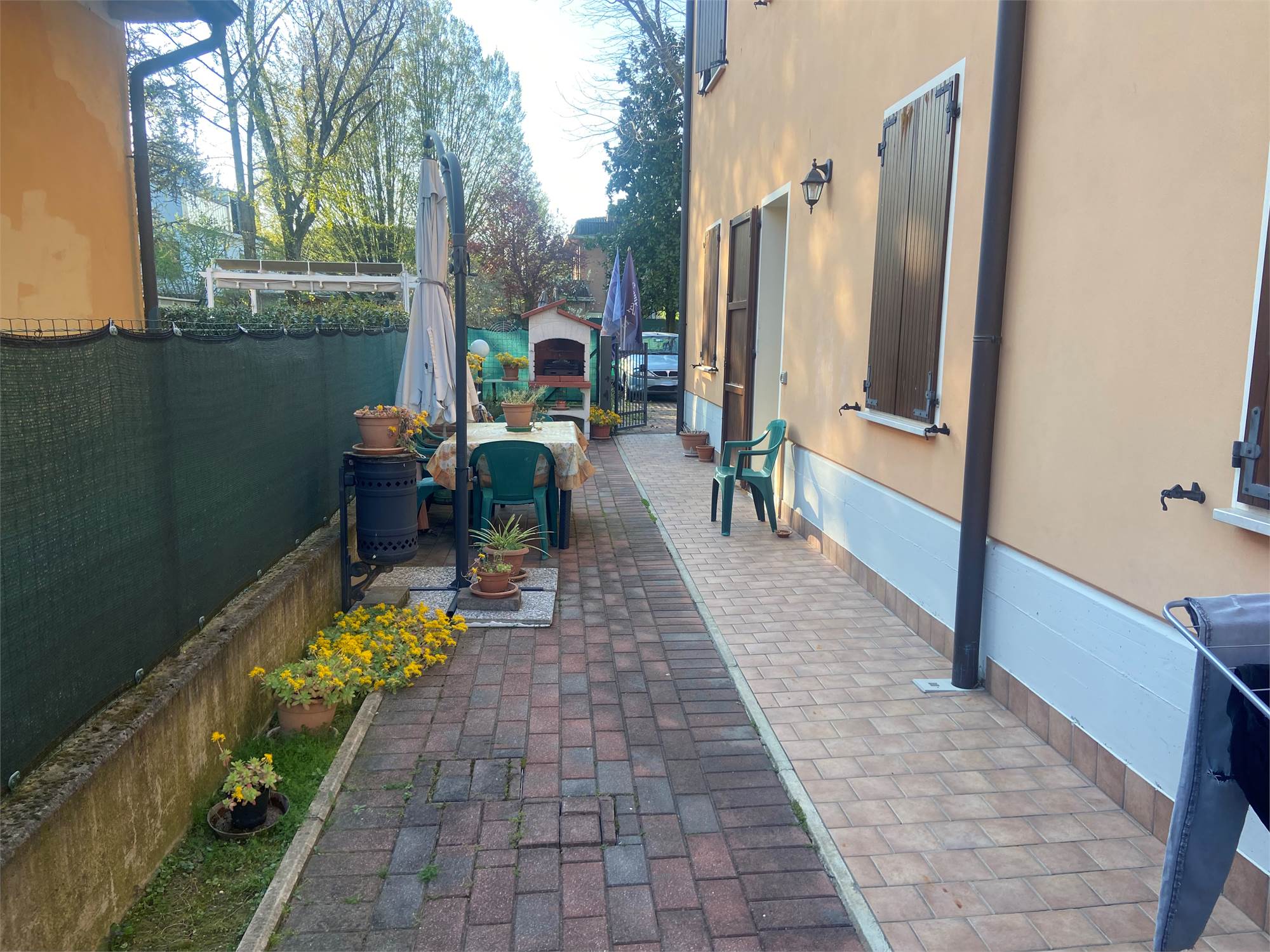 Piena proprietà di alloggio posto al piano terreno di palazzina residenziale, con autorimessa, posto auto scoperto ed area cortiliva esclusiva. L'unità è composta da soggiorno-pranzo con angolo cottura, disimpegno notte, due camere da letto, guardaroba (terza camera), servizio igienico, lavanderia (secondo bagno) ed area cortiliva esclusiva. Superficie commerciale parametrata degli immobili pari a complessivi mq. 115,00 circa; autorimessa di mq. 18,00 circa.