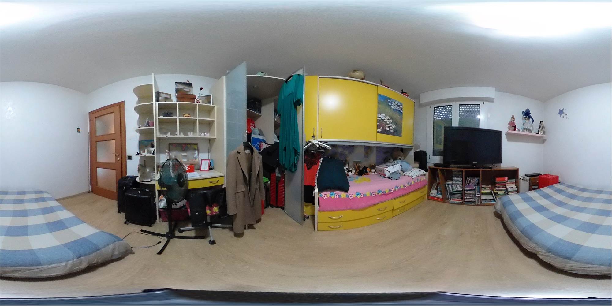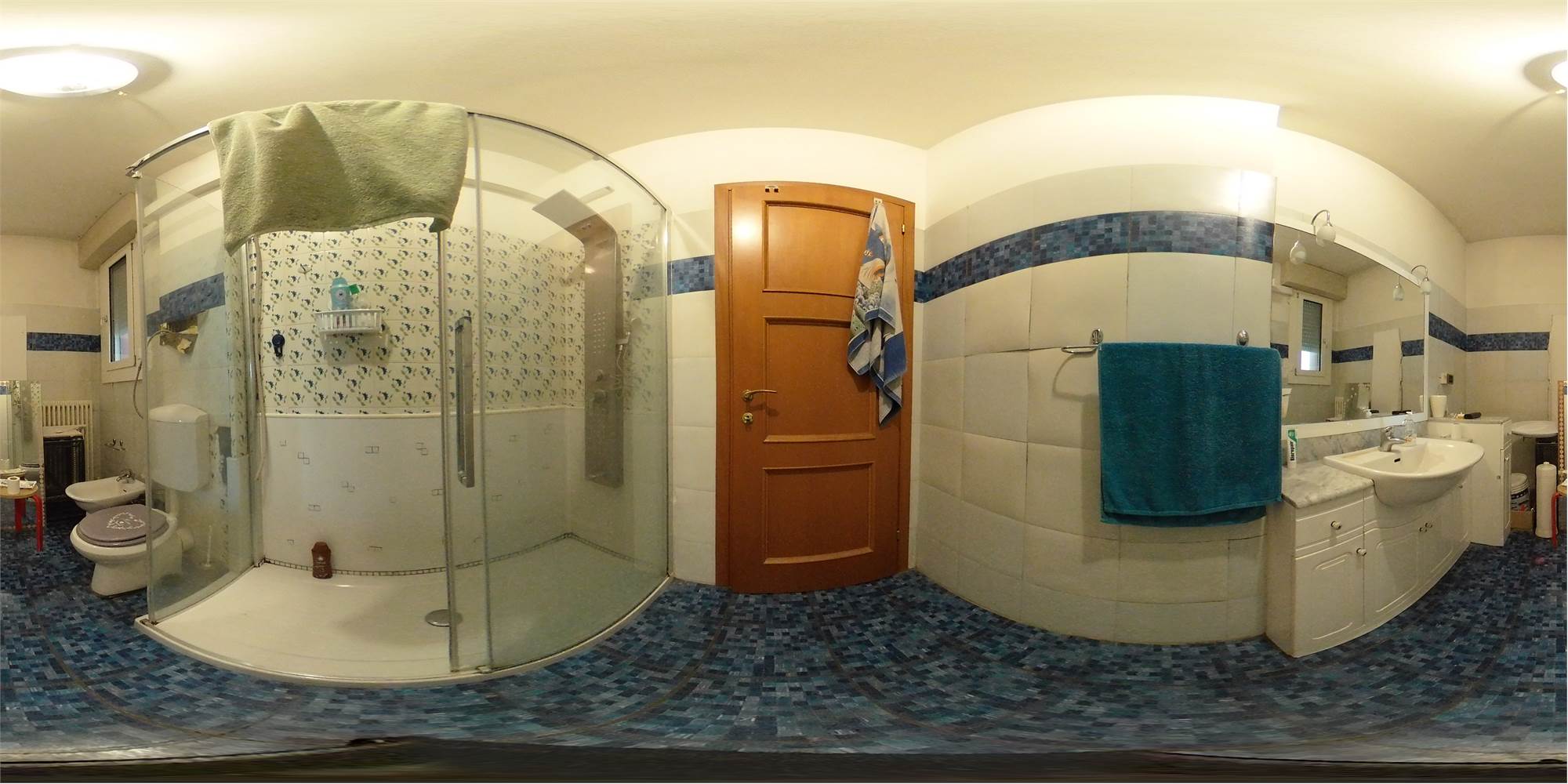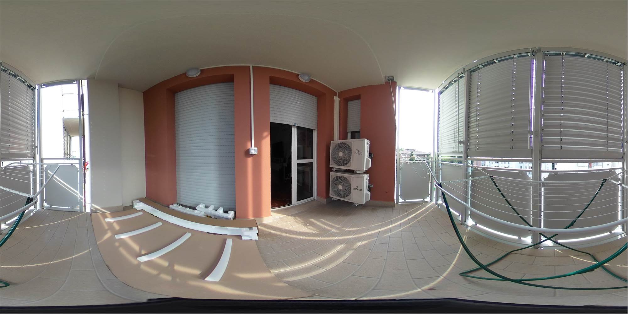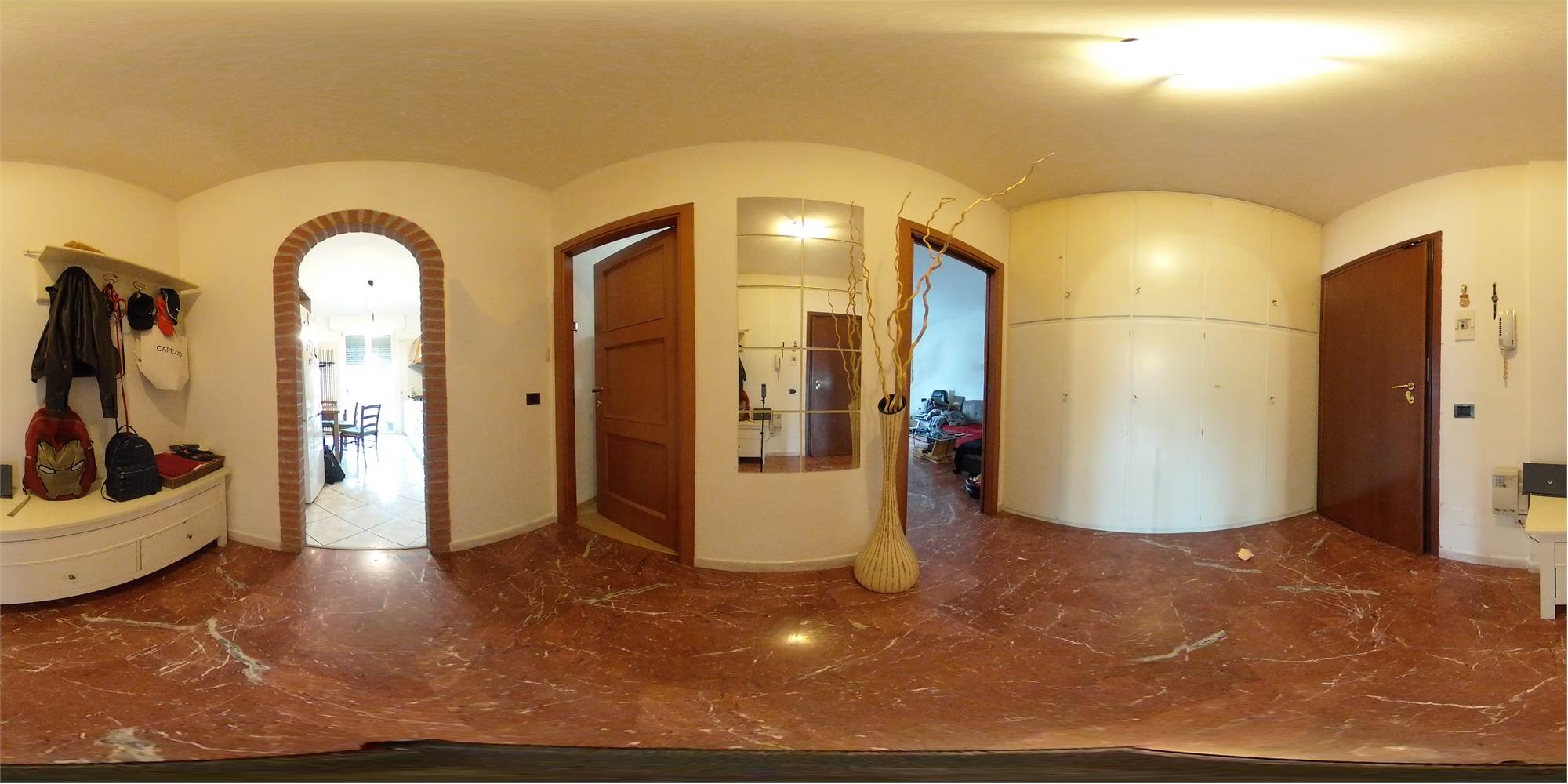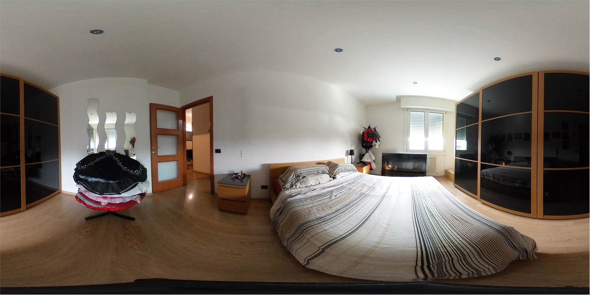 Piena proprietà di appartamento posto al quarto piano di fabbricato condominiale dotato di ascensore, con cantina ed autorimessa al piano primo sottostrada, composto da ingresso, cucina con terrazzo, ampio soggiorno con balcone, due camere da letto matrimoniali, disimpegno e due bagni. Superficie commerciale abitazione con cantina pari a mq. 112,86; autorimessa di mq. 14,80.