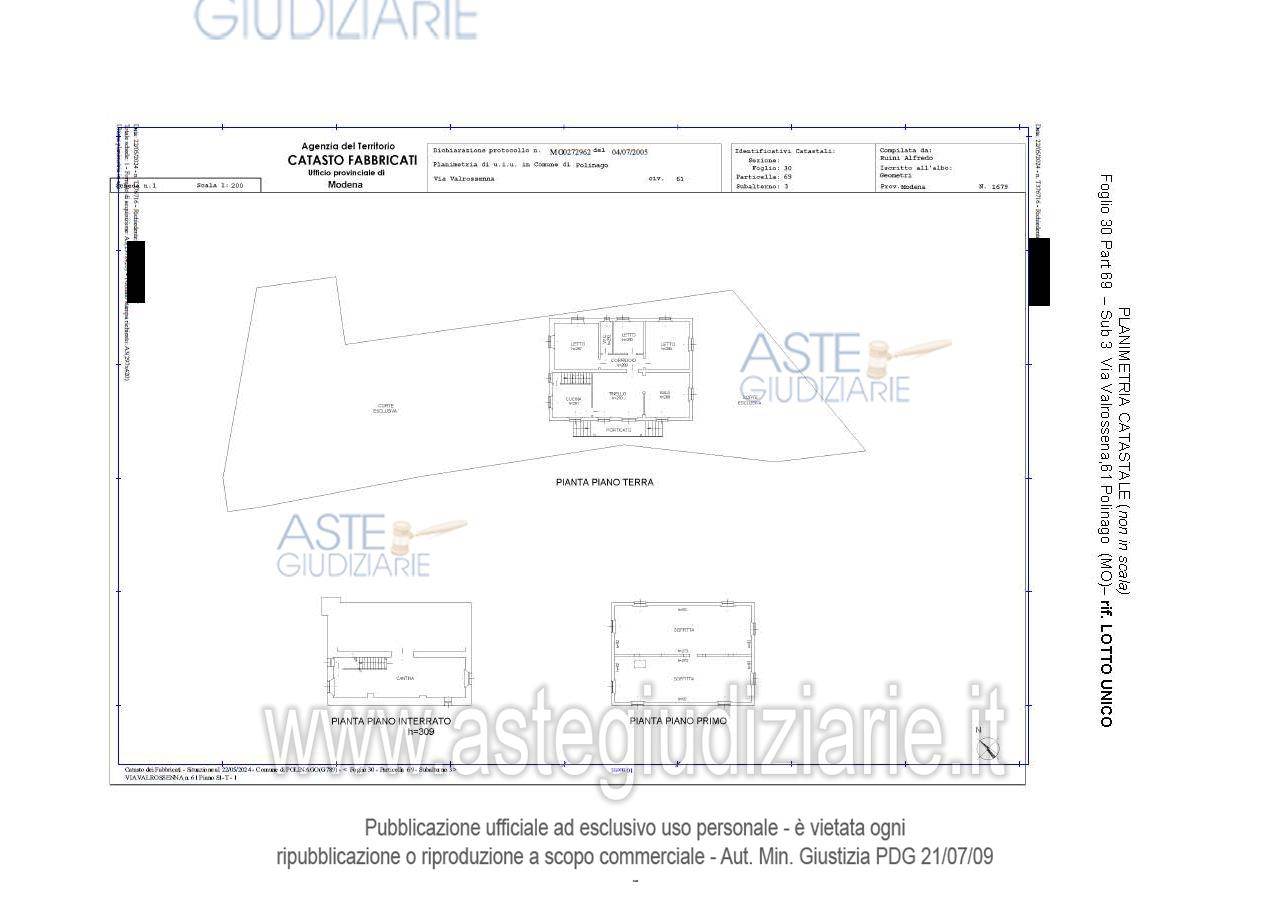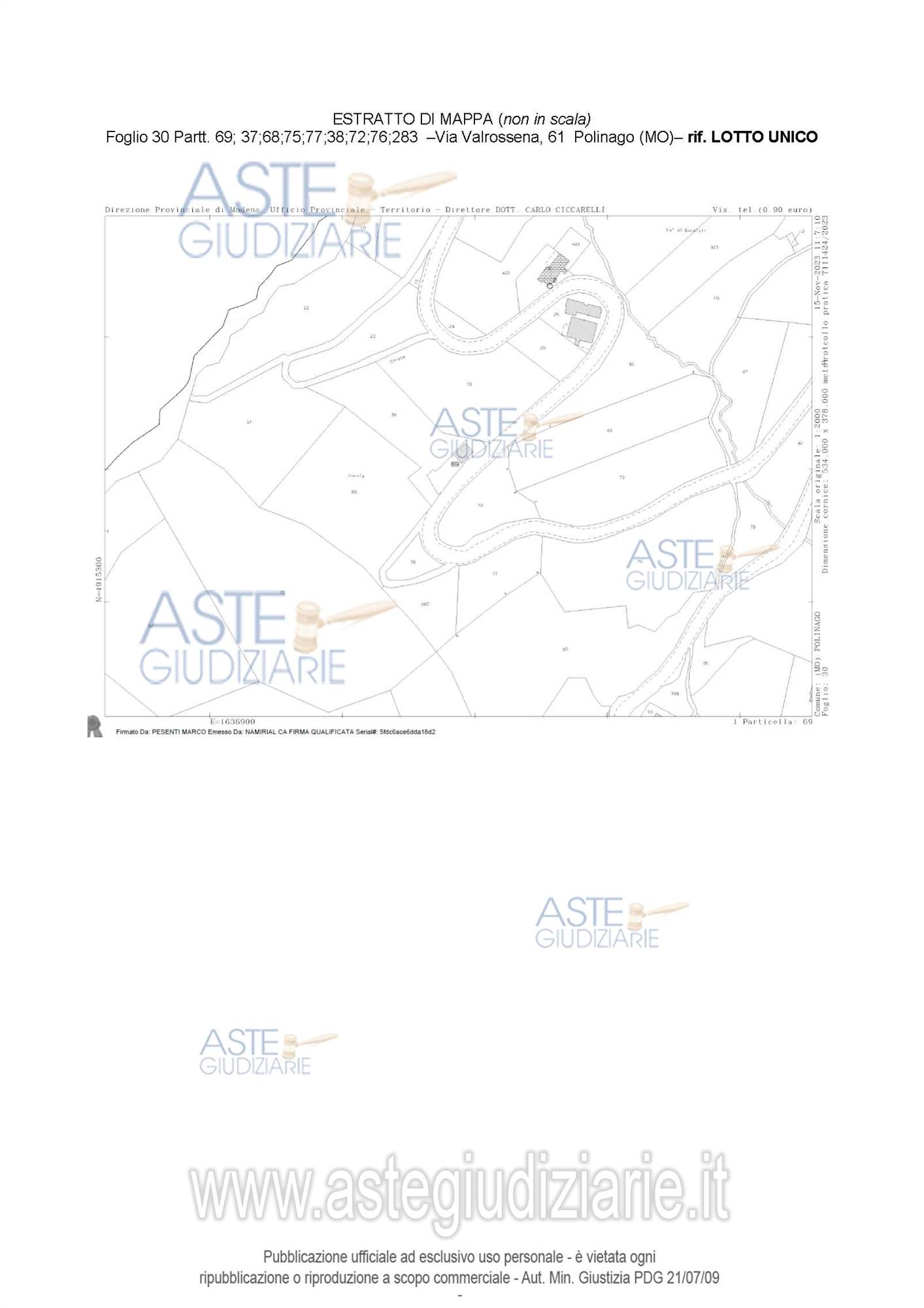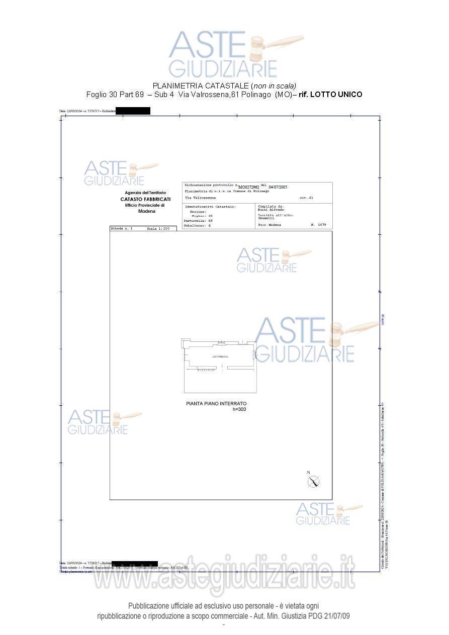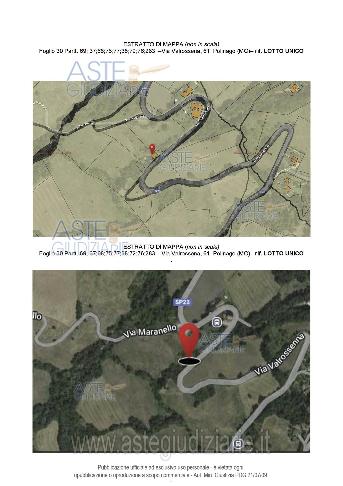 Piena proprietà di: - abitazione di tipo economico costituita da: sala – tinello, cucina, n. 3 stanze da letto, un corridoio ed un bagno a piano terra; una cantina al piano interrato; un’autorimessa al piano interrato; n. 2 soffitte comunicanti al primo piano, posta nel comune di Polinago (Mo), via Valrossenna n. 61 con annessa area cortiliva; - n. 8 appezzamenti di terreno.